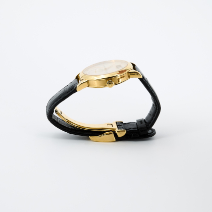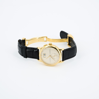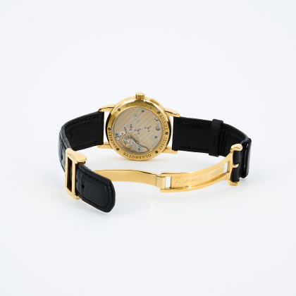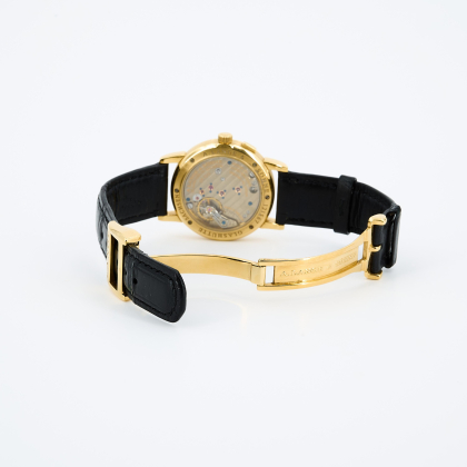 Gehäuse/Armband: 750/- Gelbgold, Lederarmband mit Faltschließe, Zffbl. silbern, Zeiger und Indizes golden.