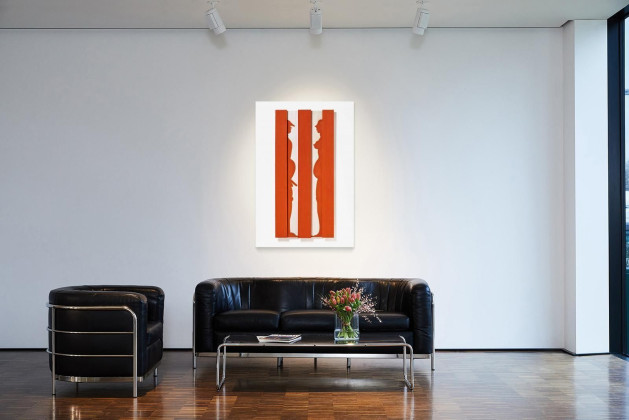 Der Schweizer Künstler und langjähriger Professor an der Düsseldorfer Akademie Alfonso Hüppi lotet in seinen Holzarbeiten immer wieder die Grenzen von Abstraktion und Figuration aus. Drei rote Senkrechten teilen das Relief in Vorder- und Hintergrund. Auf der hinteren Ebene erscheinen im Profil auf weißem Grund zwei sich anschauende Figuren im Profil, links männlich und rechts weiblich. Humorvoll und den erotischen Charakter in der geometrischen Form darstellend, erinnert das Paar in Ihrer Nacktheit und Gegenüberstellung an Sujets von Adam und Eva, während die starke Profilierung einen Bezug in ägyptische Darstellungen von Gottheiten findet. Das dynamische Zwischenspiel im starren Holzrelief von Abstraktion und Figuration, Weiblichkeit und Männlichkeit sowie Trennung und Sichtbarkeit werden in dieser Arbeit vereint.