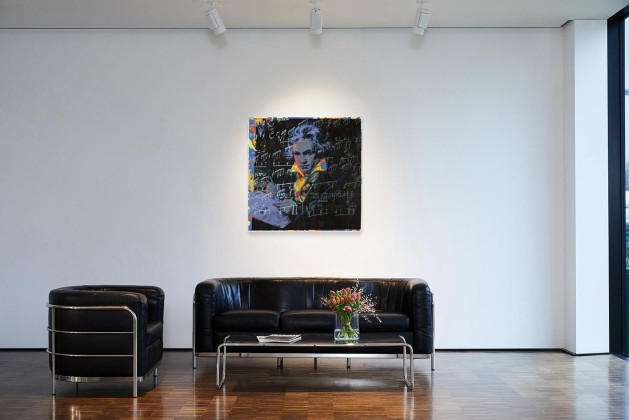 Warhols Porträt Ludwig van Beethovens demonstriert die Fähigkeit des Künstlers, Bilder zu manipulieren und sich anzueignen, um visuelle Ikonen zu schaffen. Für diese Serie greift Warhol auf ein bereits berühmtes Porträt des Künstlers Joseph Karl Stieler (1781-1858) aus dem Jahr 1820 zurück, das die Persönlichkeit des Künstlers wie kein anderes einfängt. Der ungeduldige Gesichtsausdruck, die Löwenmähne und die Hände hebt Warhol in seiner Interpretation gekonnt durch die Verwendung von Farbe hervor. Der restliche Körper verschmilzt mehr oder weniger mit dem Hintergrund. Warhol treibt Stielers visuelle Identifizierung des Komponisten jedoch noch einen Schritt weiter, über die reine Gesichtserkennung hinaus. Warhol begnügt sich nicht damit, Beethovens Handwerkszeug, das Manuskript und die Feder, zu benutzen, um auf das Talent des Komponisten anzuspielen, sondern lässt die Musik direkt über das Porträt selbst laufen. In Stielers Gemälde hält Beethoven die Partitur seiner späten »Missa solemnis« in der Hand. Die Messe zählt zu einem seiner größten Werke. Warhol wählt jedoch die Partitur seiner Klaviersonate Nr. 14 in cis-Moll - besser bekannt als die Mondscheinsonate - für sein Porträt aus. Mit der Verwendung der populäreren Mondscheinsonate beweist Warhol einmal mehr, dass er nicht ein Abbild schaffen möchte, sondern ein Klischee der Wirklichkeit, das die Person zu Legenden werden lassen.