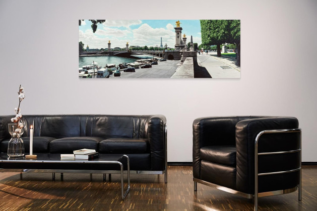 Die großformatige Panoramaleinwand des bekannten amerikanischen Fotorealisten der dritten Generation, Anthony Brunelli, zeigt die neobarocke Pont Alexandre III in Paris. Sie ist nach dem russischen Zaren Alexander III benannt und wird im Rahmen der 1900 stattfindenden Weltausstellung geplant. Die Pont Alexandre III gilt als schönste Brücke in Paris. Der Betrachter schaut vom rechten Seineufer über die gesamte Länge der Brücke auf das gegenüberliegende Ufer mit Invalidendom und Eiffelturm, ein Postkartenmotiv. Dekorativ schmücken vergoldete Statuen die Pylonen sowie an deren Basis die Zugänge zur Brücke. Sie stehen für die großen Epochen der französischen Geschichte: die Zeit Karls des Großen, die Renaissance, die des Sonnenkönigs Louis XIV, sowie die der Moderne.