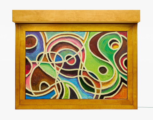 Anton Henning entwirft Rauminstallationen aus Möbeln, Tapeten, Teppichen und Lichtobjekten gepaart mit seinen Skulpturen und figurativen wie abstrakten Gemälden. Diese begehbaren Settings nennt der Künstler "Interieurs", genau wie das hier vorgestellte Werk: Ein abstraktes Gemälde, dessen Farb- und Formensprache uns in den Bann zieht und an die Meister der klassischen Moderne erinnert, wird Teil einer Holzkonstruktion mit Lichtquelle. So changiert "Interior No. 301" zwischen Möbelstück und Kunstwerk - eingebettet in den Sound der beiliegenden DVD.