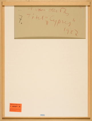 Bezeichnung: Signiert unten links: a pas (Künstlersignet). Sowie signiert, betitelt und datiert verso: A. van der Pas Titel: "Cypres" 1987. Hier zudem bezeichnet.