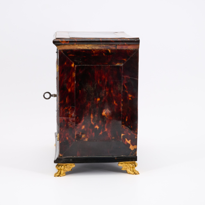 Beschreibung: Auf fein gravierten Tatzenfüßen der rechteckige Korpus mit feinem Schildpattfurnier. Innen