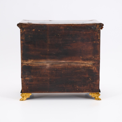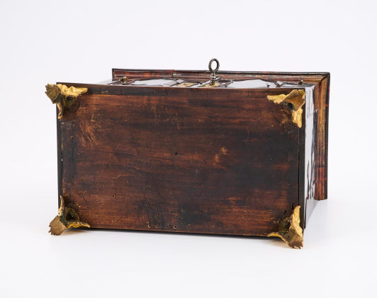 Technik: Weichholzkorpus. Schildpatt teilweise mit Goldfolie hinterlegt. Die Beschläge und Füße Messing, feuervergoldet und graviert.