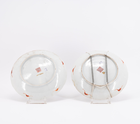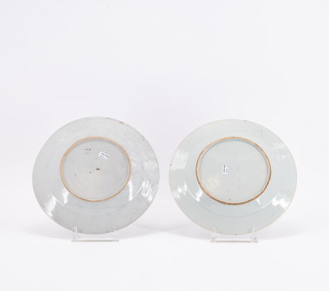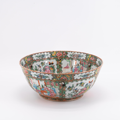 AUßERGEWÖHNLICH GROßE SCHALE UND GRUPPE VON VIER FLACHEN UND ZWEI TIEFEN TELLERN FAMILLE ROSE U.A.