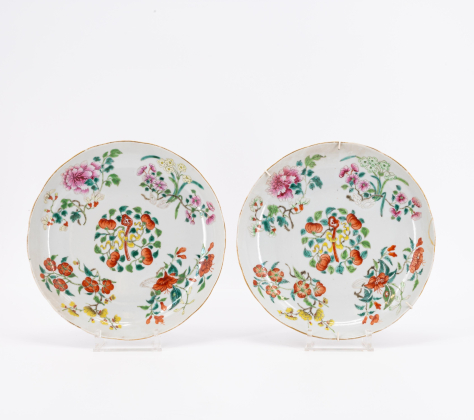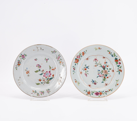 Los 512 | Außergewöhnlich große Schale und Gruppe von vier flachen und zwei tiefen Tellern Famille Rose u.a