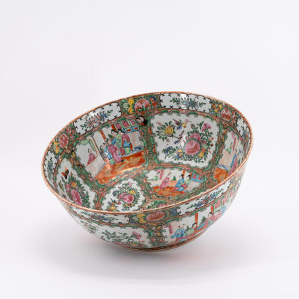 Sie wollen ein Objekt von Außergewöhnlich große Schale und Gruppe von vier flachen und zwei tiefen Tellern Famille Rose u.a  verkaufen?