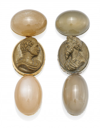 Edelsteine: Ca. 84 gelbe Saphire im Brillant-Schliff Ø ca. 2,1 - 2,7 mm, 4 Mondstein-Cabochons ca. 20,0 - 22,0 x 14,7 mm, 2 geschnitzte Gemmen 18,8 x 16,5 mm.