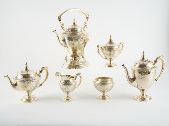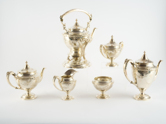 Beschreibung: Bestehend aus Wasserkessel mit Rechaud, Kaffeekanne, Teekanne, Zuckerdose, Milchkännchen