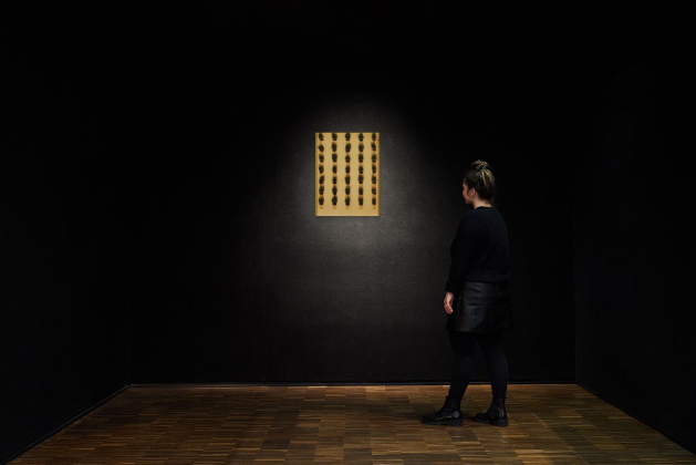 Technik: Angebrannte Streichhölzer auf Karton.