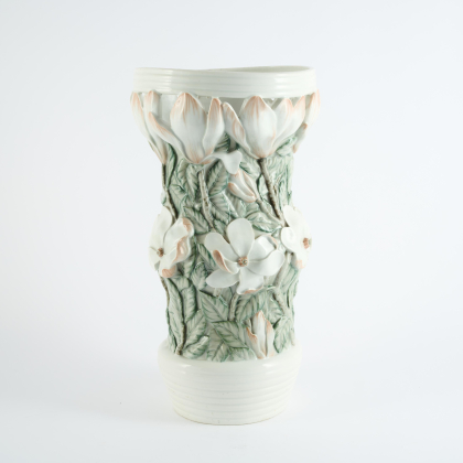 Die größte technische Herausforderung stellt die ungewöhnliche Form der Vase dar. Im Querschnitt runder Korpus übergeht an der Mündung zu einem Oval. Die Oberfläche des Mittelfelds ist flächendeckend mit reliefierten Magnolien gestaltet. Die starke Reliefierung verbirgt komplett die Grundform und lässt das harte Porzellan organisch aussehen. Im Kontrast zum massiven Stand mit wulstigen Ringen verleiht feine Durchbrucharbeit zwischen den einzelnen Blüten unter dem oberen Rand dem Ganzen Leichtigkeit und Eleganz. Es ist leicht zu erkennen, dass die Künstlerin unter starkem Einfluss von Effie Hegermann-Lindencrone und Fanny Garde stand.