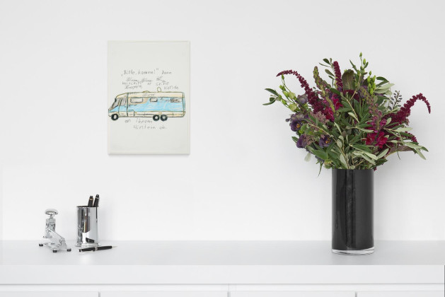 Birgit Brenner Deutschland Zeitgenössische Kunst Unikate 1990er Rahmen (35,5 x 27cm) Automobil Papierarbeit Kreide Schrift