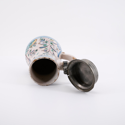 Technik: Keramik, heller Scherben, weiß glasiert, polychrom gefasst, Zinnmontierung.