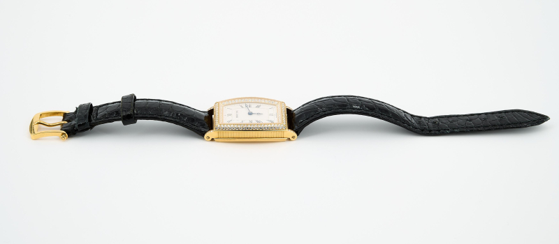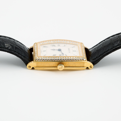 Gehäuse/Armband: 750/- Gelbgold mit Brillantbesatz, 204 Brillanten zus. ca. 1,63 ct., Lederarmband mit Dornschließe, Zffbl. silbern, Zeiger gebläut.