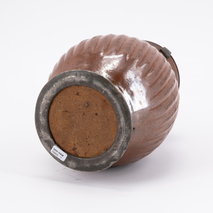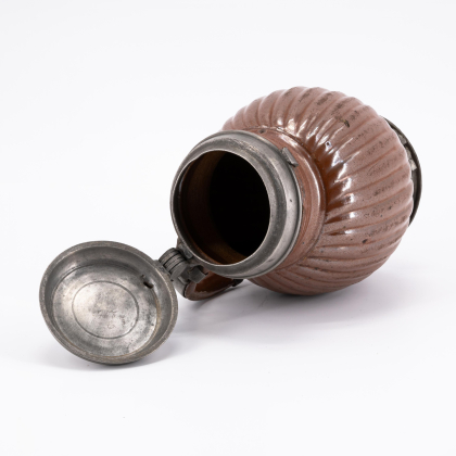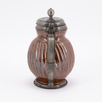 Technik: Brauner Scherben mit brauner Lehmglasur. Zinnmontierung.