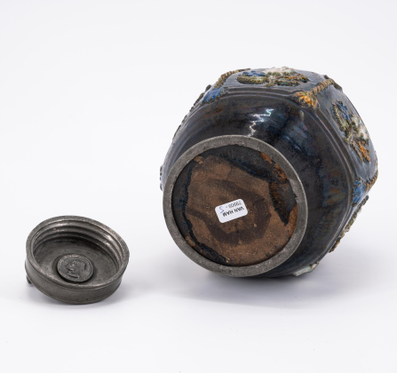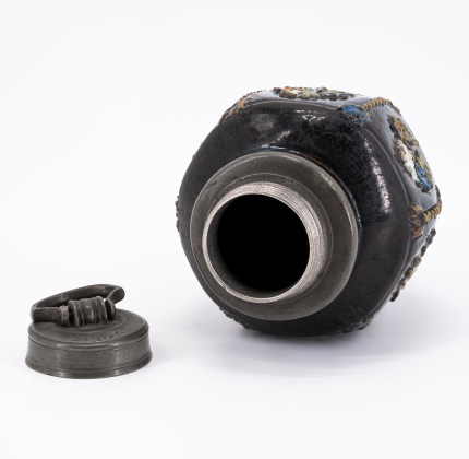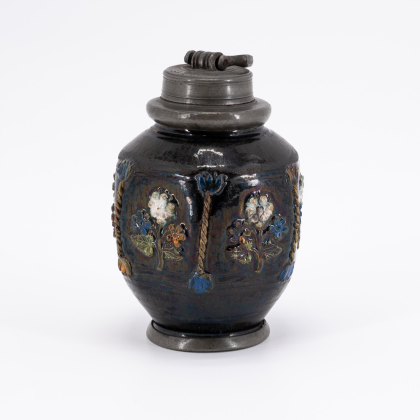 Technik: Brauner Scherben mit dunkelbrauner Lehmglasur und farbigem Dekor. Zinnmontierung.