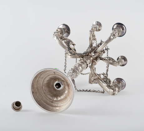 Schlanker, balusterförmiger Schaft mit reichem Reliefdekor. Darauf großer, zweireihiger Kandelaberaufsatz mit insgesamt acht eingedrehten Akanthusarmen. Diese in weiblichen Köpfen mit ägyptischem Kopfschmuck endend, darauf jeweils große Vasentüllen mit eingesteckten Tropftellern. Die Arme untereinander durch Gliederketten verbunden. Zentrale Bekrönung des Aufsatzes durch ebenfalls reich gearbeitete Vase. Der Deckel mit Zapfenknauf abnehmbar und als zusätzliche Kerzentülle zu verwenden.