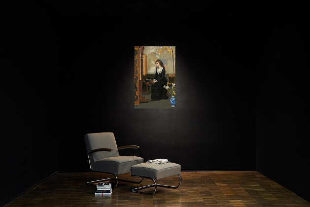 Sitzende junge Frau betrachtet ein Gemälde im Atelier.