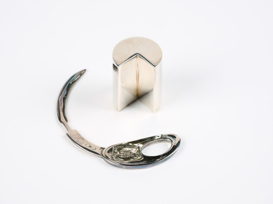 Technik: In der Form verzerrter Schlüssel und geometrisches Objekt, je in Sterling-Silber gegossen, Silber-Kette. In schwarzer Karton-Box.