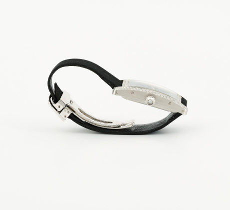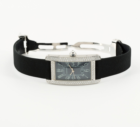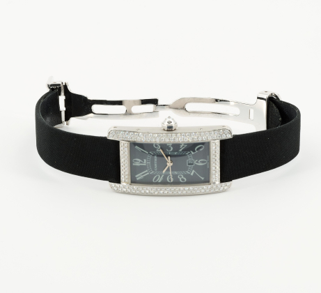 Gehäuse/Armband: 750/- Weißgold besetzt mit 142 Brillanten zus. ca. 1,9 ct., Textil-Lederarmband mit Faltschließe, Zffbl. grau, Zeiger silbern, arabische Ziffern hellgrau.