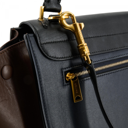 Beschreibung: Schwarzes, dunkelblaues und braunes Leder. Einfacher Henkel. Seitliche Druckknöpfe