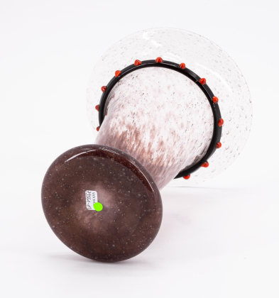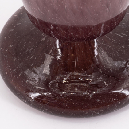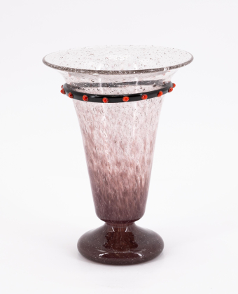 Material: Farbloses Glas, nach unten mit violetten Pulvereinschmelzungen. Heiß appliziertes Glasband in Violett mit roten Glasperlen.