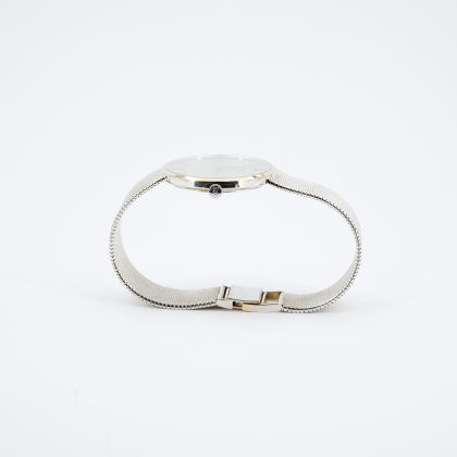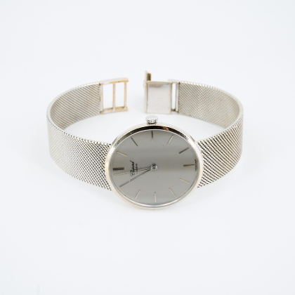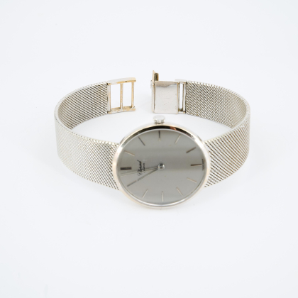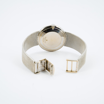 Gehäuse/Armband: 750/- Weißgold, Milanaiseband mit Kastenschließe, Zffbl., Zeiger und Indizes silbern.