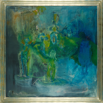 Hochstehende Farbscholle an einer Kante (ca. 0,8cm). Ansonsten guter Zustand. Das Werk wurde für die Katalogbeschreibung nicht ausgerahmt.
