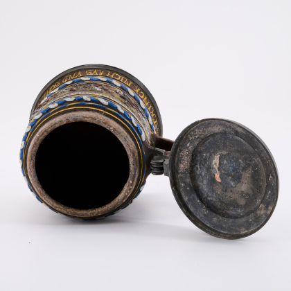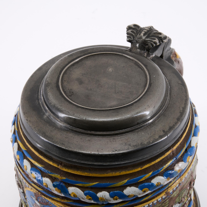 Technik: Braunes Steinzeug, salzglasiert, polychromer Emaildekor, Zinnmontierung.