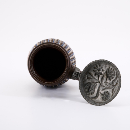 Technik: Braunes Steinzeug, salzglasiert, polychromer Emaildekor, dezent gold staffiert, Zinnmontierung.