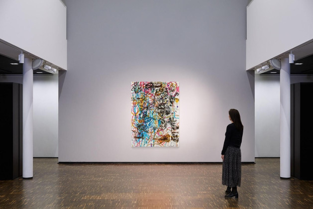 Das Frühwerk von Daniel Richter ist geprägt von farbintensiven und dynamischen Komposition. Die zum Aufruf kommende Arbeit stammt aus dem Jahr 1999 und somit aus dem Ende der ersten, abstrakteren Werkphase Richters. Eine besondere Rolle in Richters abstrakten Arbeiten spielt dabei die Linie. In gewundener, chaotischer Manier führen verschieden stark ausgeprägte Linien den Betrachter durch das Bild und hinterlassen den Eindruck eines zeichnerischen Duktus. Die vorliegende Arbeit bietet einen seltenen Einblick in den Transformationsprozess den das Oeuvre Richters um die Jahrtausendwende durchlebte. In seinen anfänglich noch rein abstrakten Arbeiten halten immer mehr figürliche Elemente Einzug, bis die Sujets schließlich fast expressionistisch anmuten. Die großformatige Arbeit weist neben den charakteristisch leuchtenden Farbkompositionen auch einzelne figurative Elemente auf und gibt so bereits einen frühen Ausblick auf Richters spätere künstlerische Entwicklung. Besonders das Motiv eines fallenden Körpers oder zu grotesken Fratzen verformte Gesichter tauchen in der Arbeit immer wieder auf und scheinen wie Vorboten für die kryptisch aufgeladenen und später auch stärker politisierten Werke Richters zu sein.