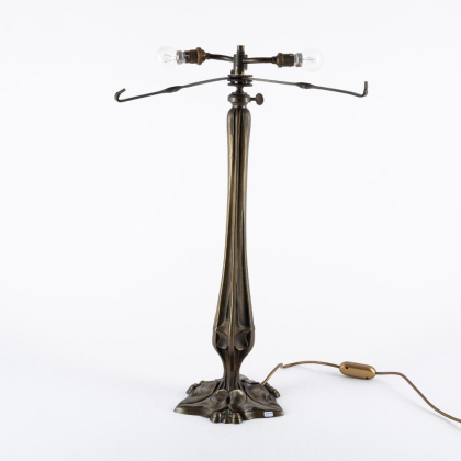 Beschreibung: Der Lampenfuß in Blattornamentik. Der Lampenschirm schalenartig, flach und weit auskragend.