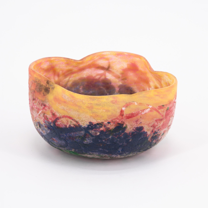 Material: Farbloses Glas mit gelben, weißen und violetten Pulvereinschmelzungen. Überfang in Rot, Weiß, Grün und dunklem Violett.