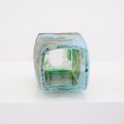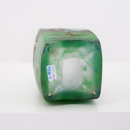 Material: Farbloses Glas mit milchig weißen und hellblauen Pulvereinschmelzungen. Farbiges Emaildekor.