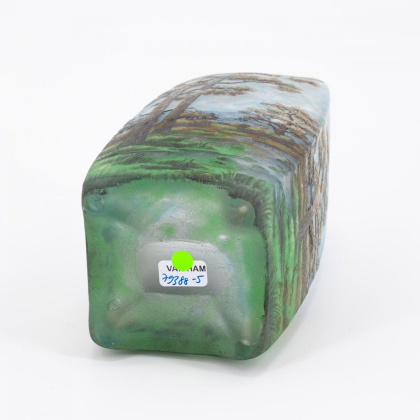geätztes Dekor mit Emailbemalung, welches eine sattgrüne Landschaft mit Laubbäumen vor