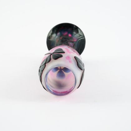 Material: Farbloses Glas, milchig weiße und purpurfarbene Pulvereinschmelzungen, purpurfarbener und dunkelvioletter Überfang, feine Binnenzeichnung, partiell Martelé-Schliff.