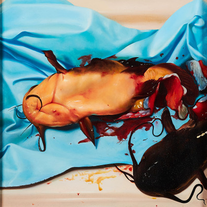 David Nicholson steht mit seinem Catfish den Feinmeistern des barocken Fischstillebens in nichts nach. Einzigartig ist seine perspektivische Untersicht auf den Fisch, die eine Isomorphie alles Fleischlichen verdeutlicht.