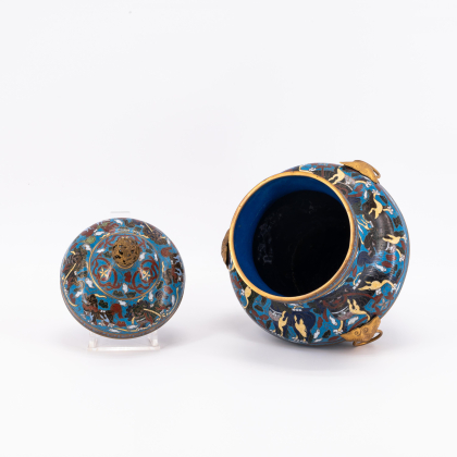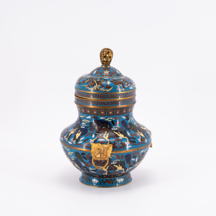 DECKELVASE MIT DREI HANDHABEN CLOISONNÉ.