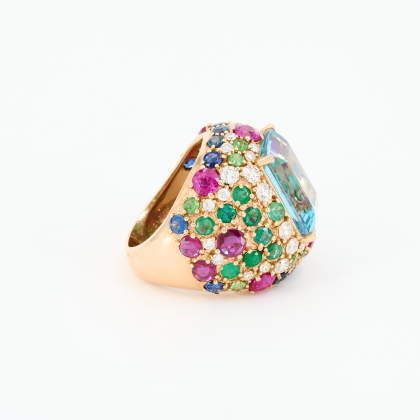 Edelsteine: 1 Aquamarin im Emerald-Schliff ca. 10,6 ct., 12 runde, facettierte Rubine, 18 runde, facettierte Smaragde, 12 runde, facettierte Tsavorite, zus. ca.3,8 ct.