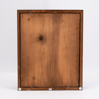 Technik: Glas mit deckendem Farbauftrag, teils in Églomisé-Technik mit Blattsilber hinterlegt.