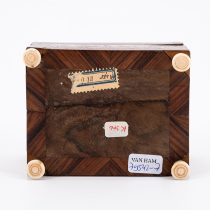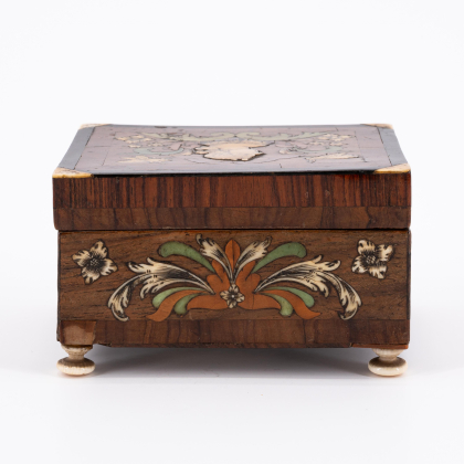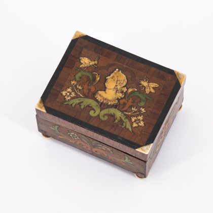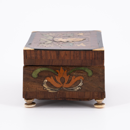 Technik: Verschiedene Hölzer, teils gefärbt, Knocheneinlagen, graviert.
