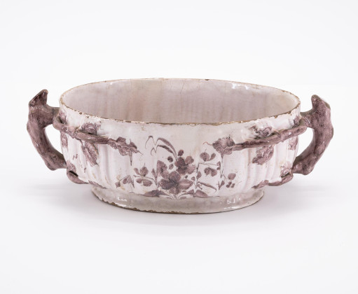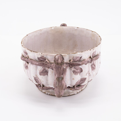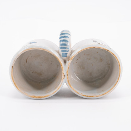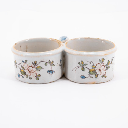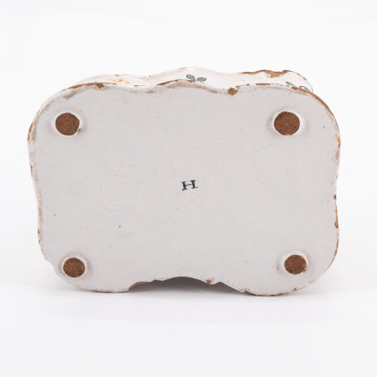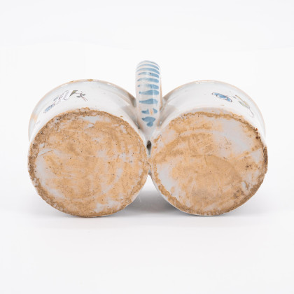 Technik: Heller und rötlicher Scherben, weiße Glasur mit polychromem Dekor.