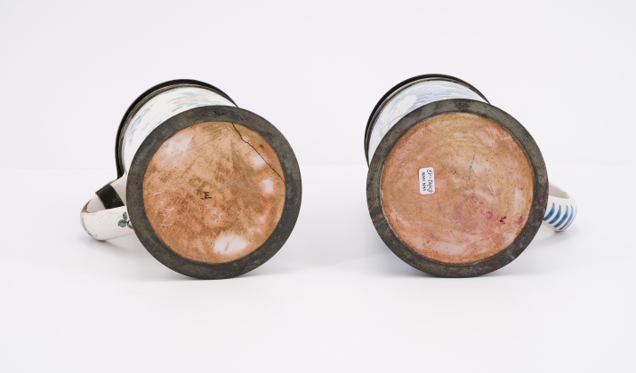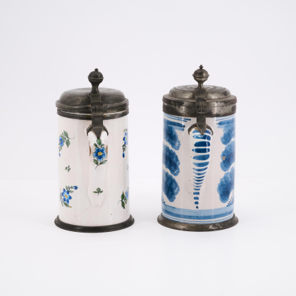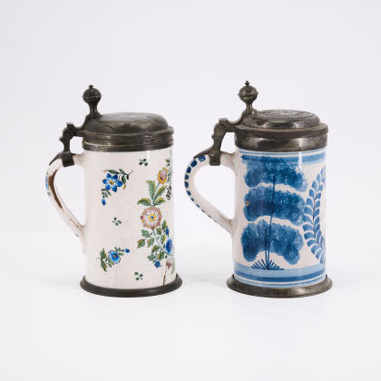 Technik: Beiger Scherben mit weißer Glasur und blauem bzw. polychromem Dekor. Zinnmontierung.