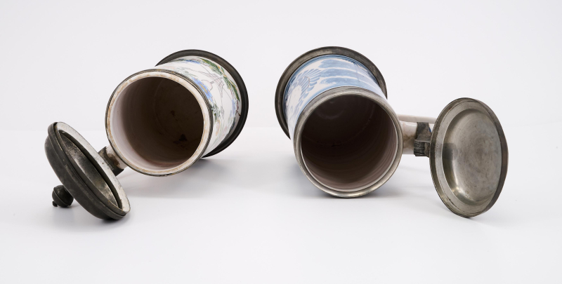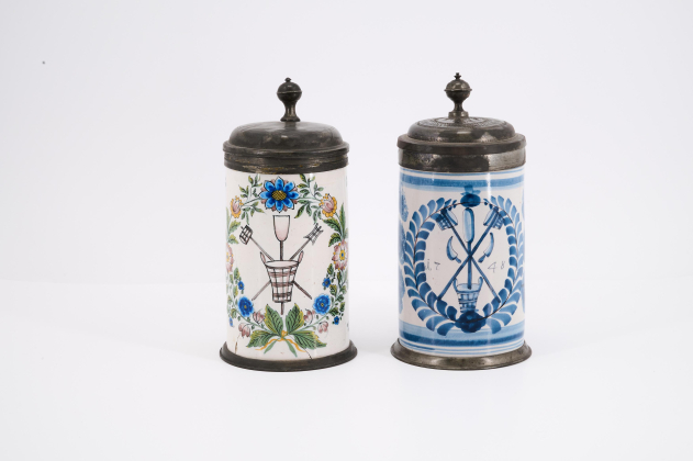 ZWEI WALZENKRÜGE MIT ZUNFTZEICHEN DER BIERBRAUER.