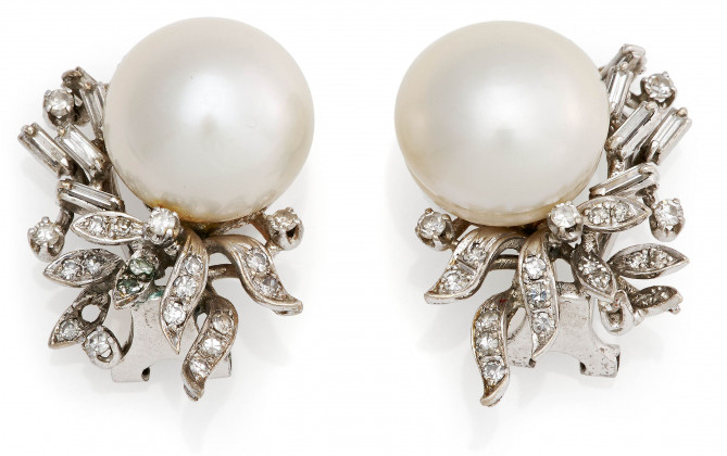 Org. Substanzen: 2 Zuchtperlen, leicht bouton-förmig, Ø ca. 13,3 mm.