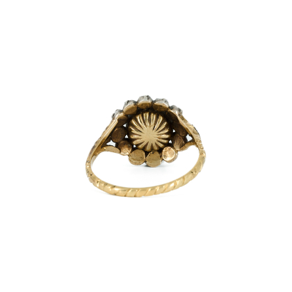 Diamanten: 12 winzige Diamanten im Rosen-Schliff Ø 2,0 mm, 1 Diamant mittig im Rosen-Schliff Ø ca. 7,4 mm.