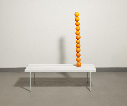 Technik: Orangen auf Metallstange, auf lackierter Holzbank montiert.