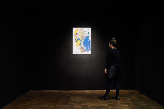Minimaler Teilfingerabdruck in der unteren linken Ecke (herstellungsbedingt?). Leichte Griffspuren an den seitlichen Blatträndern mittig. Minimal anhaftender dunkler Schmutzpartikel im Bereich der blau-farbigem Bereich rechts. Ansonsten ist das Werk in einem guten Zustand.