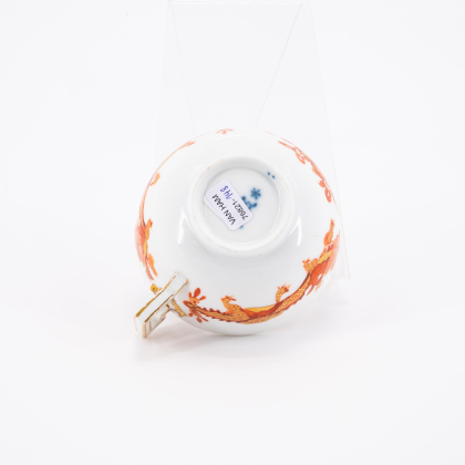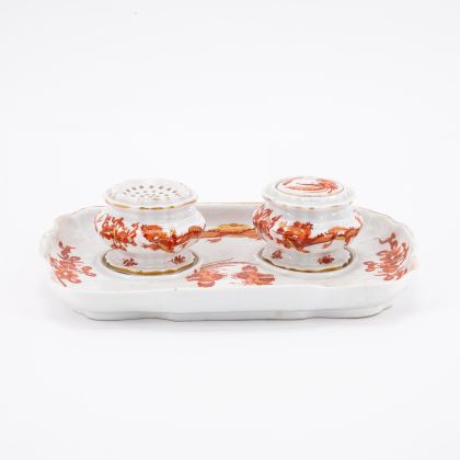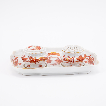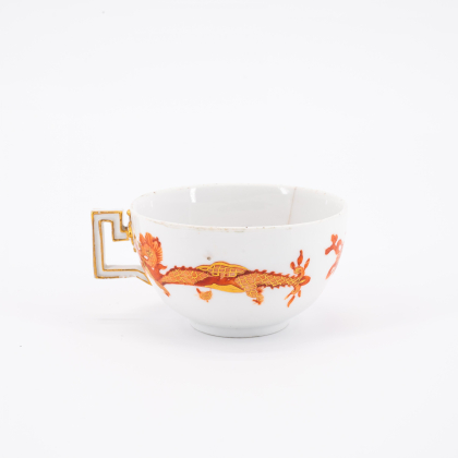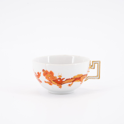 DREITEILIGES SCHREIBSET, SPEISETELLER UND TEETASSE MIT DEKOR "ROTER DRACHE".