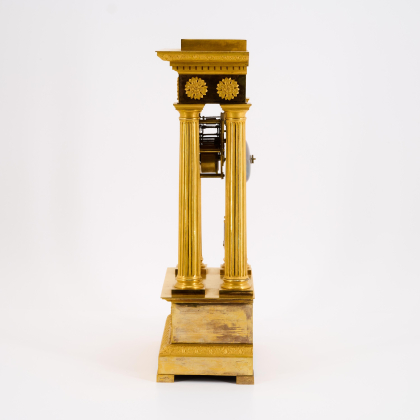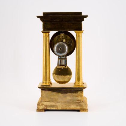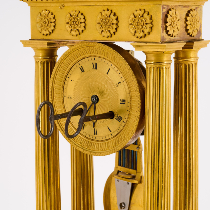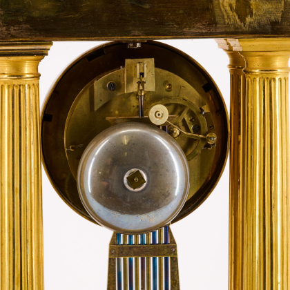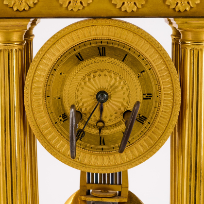 Beschreibung: Zifferblatt mit römischen Stunden. Rundes 14-Tage-Pendulenwerk mit Federaufhängung und Halbstundenschlag auf Glocke